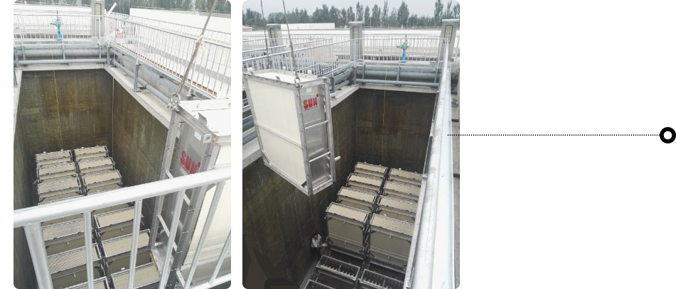 SUN?的平板膜采用PVDF材料,其擁有更好的化學(xué)穩(wěn)定性、抗污染性和機(jī)械強(qiáng)度。公 司采用先進(jìn)的制膜工藝,控制膜孔徑在 0.1um,并且有更高的產(chǎn)水通量和出水 水質(zhì)。板子采 用榫卯配合,膜片間距更穩(wěn)定,無(wú)需側(cè)裝板。膜片安裝時(shí),可從頂部向下安裝,也可從側(cè)部 安裝,不受施工現(xiàn)場(chǎng)條件限制。